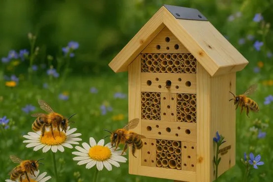 Ein Wildbienenhaus ist eine nützliche Ergänzung für naturnahe Gärten und hilft den Bestand an Bestäubern unserer Kulturpflanzen zu erhalten. Wildbienen und andere Nützlinge legen die Brut in die Löcher und Röhrchen dieser Nisthilfe. Die verschiedenen Durchmesser der Löcher werden von unterschiedlichen Insekten bevorzugt.