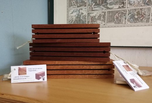 Designer-Schlüsselbrett aus Mahagoni - hergestellt aus einer alten Treppenstufe. Upcycling vom Feinsten :-)